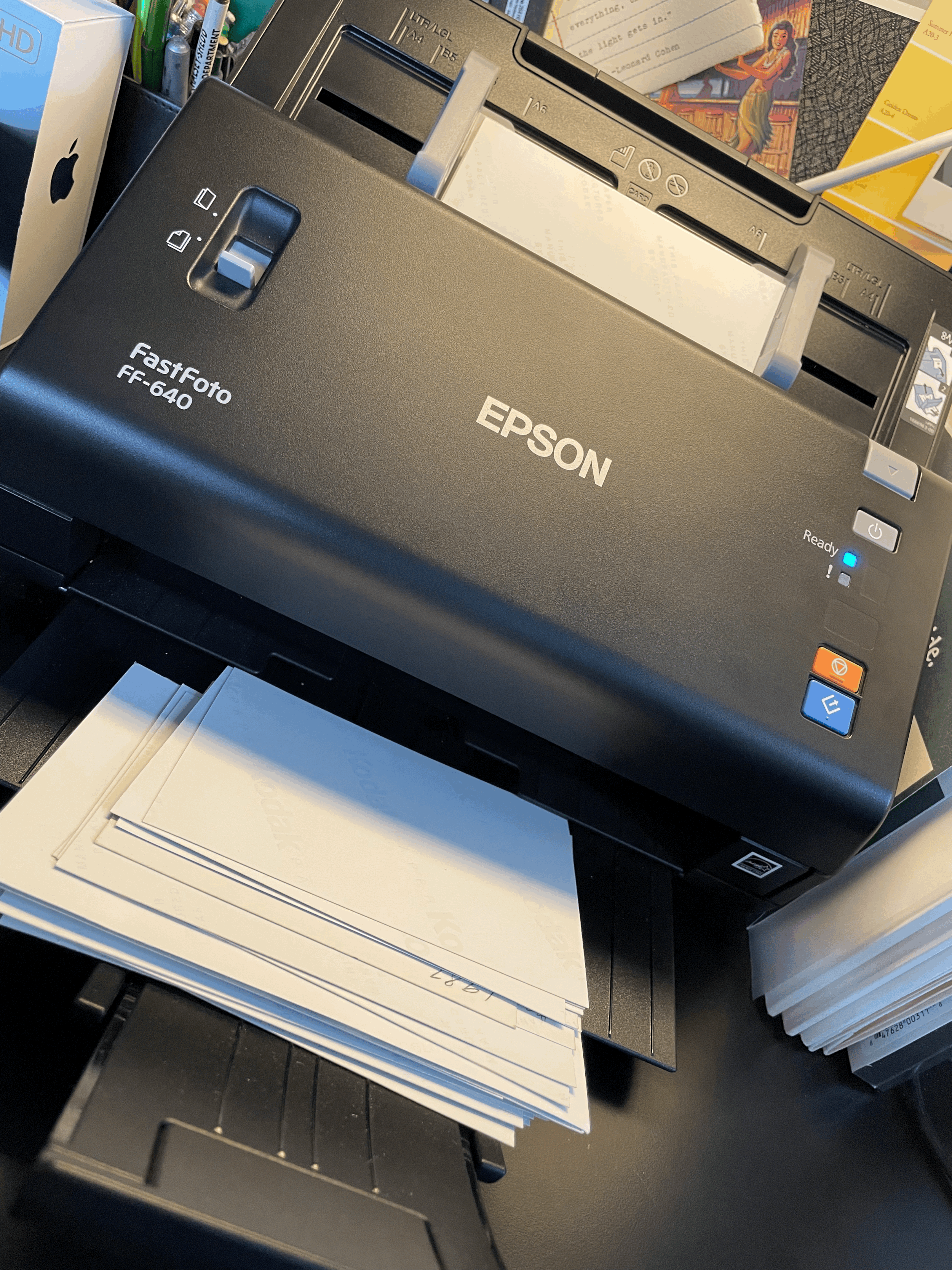 Thirty photos in less than two minutes. We separate prints by vertical, horizontal and size. The scanner also has a setting to scan the front and back of a photograph for those old pictures with great grandma’s handwritten note on the back.